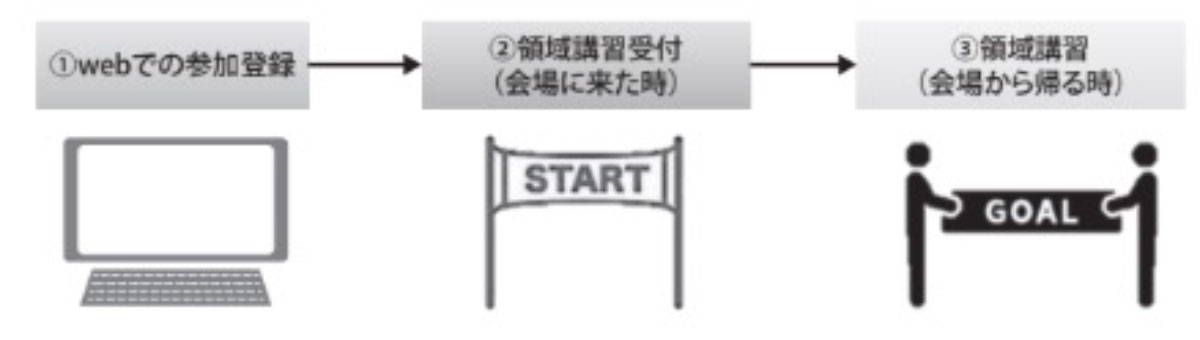 - 方法:現地での学会参加期間中は、来場(学会場に来た時)および退場時(学会場から帰る時)に領域講習受付を会員ICカードで行ってください。受付時間より1日の滞在時間を記録し、その間に開催されていた領域講習の単位が付与されます。